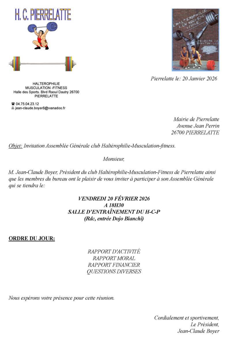 M. Jean-Claude Boyer, Président du club Haltérophilie-Musculation-Fitness de Pierrelatte ainsi que les membres du bureau ont le plaisir de vous inviter à participer à son Assemblée Générale qui se tiendra le: